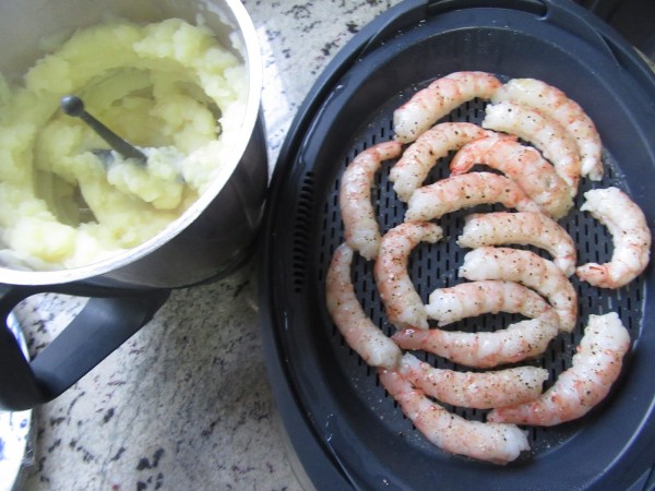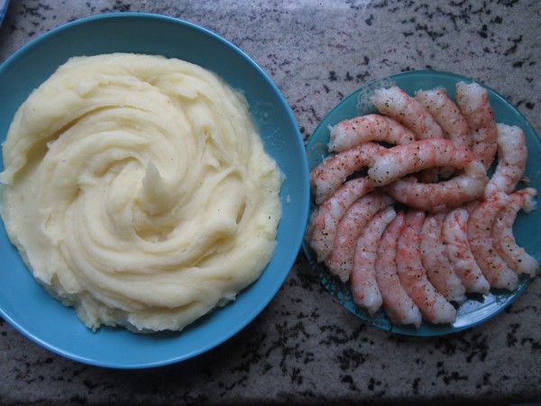 Puré y gambones al vapor