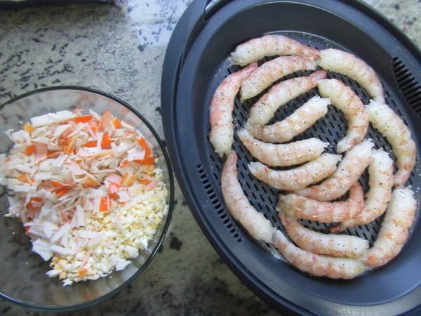2- Colocar los gambones pelados salpimentados en la bandeja del varoma. Reservar.