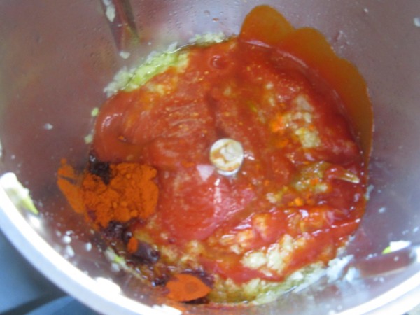 2- Agregar el tomate frito, cayena, pimentón, sal, colorante y vinagre, 5 min., Varoma, vel.3. Rectificar de sal y picante y triturar 25 seg., vel.8.