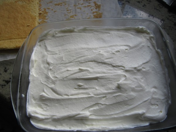 1- Con las tres partes bien frías. Cortar la plancha de bizcocho en dos, del tamaño de la fuente. Colocar una plancha encima del tocino, una buena capa de nata montada y tapar con la otra plancha. Apretar un poco con las manos. (Se puede almibarar un poco el bizcocho, yo no lo hago, si no empalaga tanta azúcar). Llevar a la nevera que tome todo cuerpo.