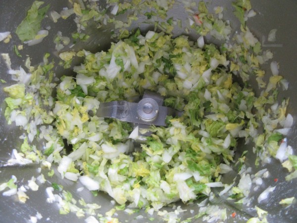 2- Sin lavar el vaso, picar la cebolleta y cogollo lechuga partido en 4 trozos, 4 seg. vel.4., bajar restos hacia las cuchillas, añadir la pulpa de los aguacates y zumo limón, 5-6 seg. vel.3. Según os guste más o menos triturado, así quedan trocitos, si os gusta más triturado, poner unos segundos más.
