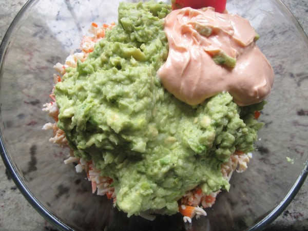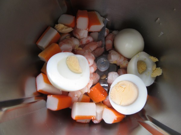 1- Picar los langostinos, palitos cortados en trozos y huevos en mitades, 4 seg. vel. 4. Reservar en un bol amplio.