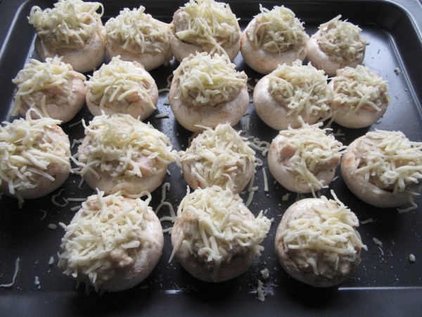 5- Rellenar los sombreritos, espolvorear queso rallado y horno pre-calentado a 210º, unos 25-30 minutos, hasta que tengan color.