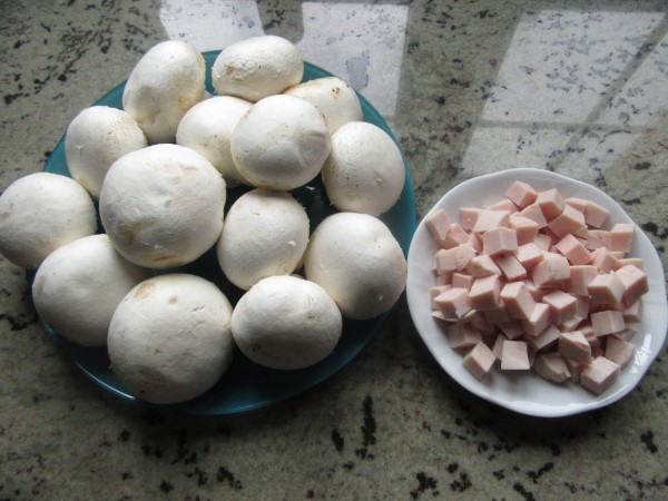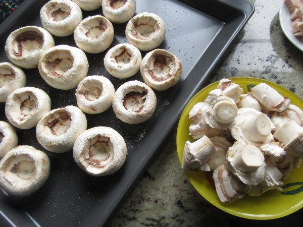 1- Quitar los pies a los champiñones. Salpimentar los sombreritos y colocar en una bandeja de horno. Reservar.