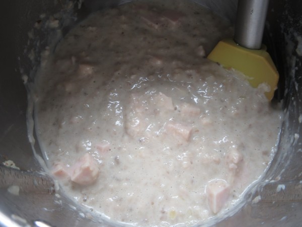 4- Harina 2 min., 100º, vel. 1. A continuación, leche, fiambre en daditos, sal, pimienta, nuez moscada, 6 min., 100º, giro izda, vel.2. Dejar templar 10-15 minutos.