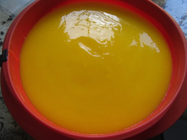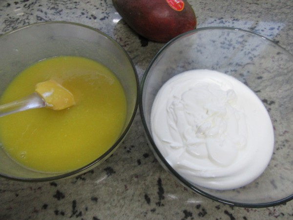 4- Añadir la gelatina bien escurrida, 10 seg. vel.3. Agregar al resto de puré de mango reservado y mezclar. Dejar templar unos minutos.