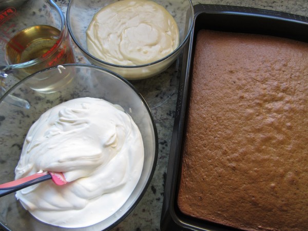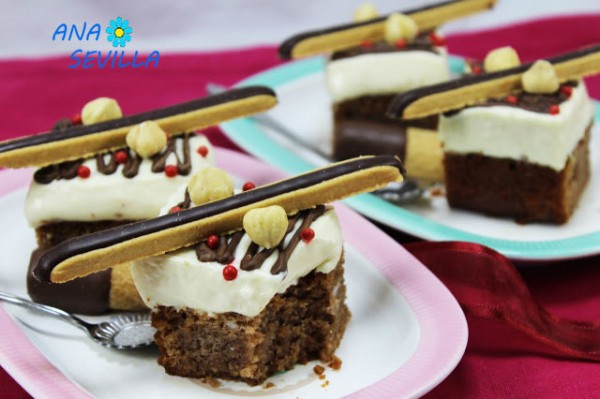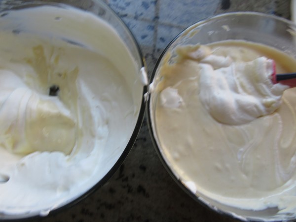 3- Sin lavar el vaso, semi-montar 450 gr. nata sin mariposa a vel. 4 unos segundos (No montarla del todo). Después mezclar con la crema Kinder con movimientos envolventes. Extender sobre el bizcocho y llevar a la nevera unas horas.