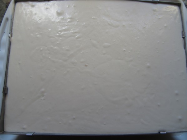 3- Sin lavar el vaso, semi-montar 450 gr. nata sin mariposa a vel. 4 unos segundos (No montarla del todo). Después mezclar con la crema Kinder con movimientos envolventes. Extender sobre el bizcocho y llevar a la nevera unas horas.