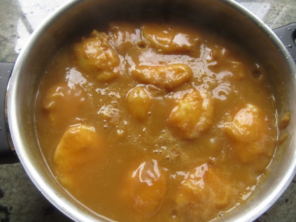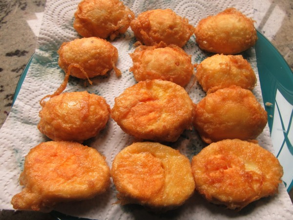 5- Refrescar los huevos, pelar, cortar por la mitad, pasar por harina y huevo y freír hasta que se dore el rebozado. Escurrir el exceso de grasa con papel de cocina. Colocar en una cazuela. Triturar la salsa, 30 seg. vel.10. Volcar sobre los huevos y cocer a fuego bajo-medio unos 10 minutos.