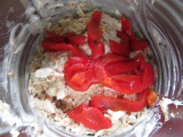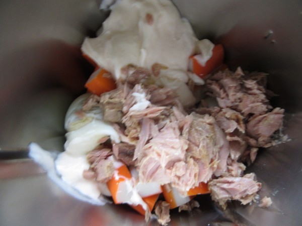 1- Huevos cocidos enteros, palitos por la mitad, atún y mayonesa, 5 seg. vel.4. Bajar restos hacia las cuchillas, añadir los pimientos en tiras, otros 5 seg. vel.4.