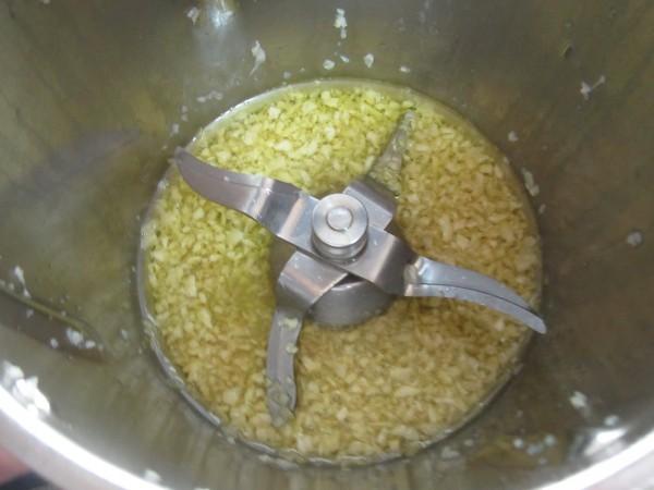 2- Picar los ajos, 4 seg. vel.5. Bajar restos hacia las cuchillas, añadir el aceite, 6 min., Varoma, vel. cuchara.