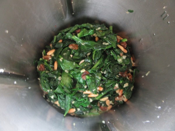 3- Agregar las espinacas, aplastar un poco, pasas, piñones, sal y pimienta, 5 min.Varoma, giro izda., vel cuchara.