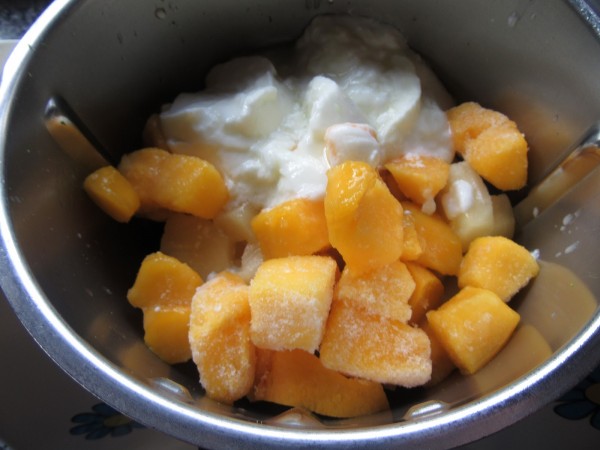 2- Todos los ingredientes al vaso, fruta semi-congelada, ralladura, zumo, yogures y azúcar o sacarina, 1 min. Vel.5-8-10. Llevar al congelador. (Si las cuchillas hacen el vacío, parar la th, bajar restos hacia las cuchillas y volver a triturar).