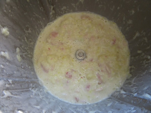 4- Leche ideal, pulpa bien escurrida de calabacín, sal, pimienta y nuez moscada 2 seg. vel.4. Después, 4 min., 100º, vel, cuchara.