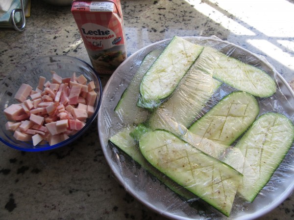 1- Cortar los calabacines en dos y a lo largo, por la mitad transversalmente, hacer unos cortes en cruz, salpimentar y regar con un chorrito de aceite de oliva. Tapar con film, hacer unos agujeritos y llevar al microondas a máxima potencia unos 8 minutos. Dejar templar y vaciar. Reservar la pulpa bien escurrida en un colador apretando y los cascos.