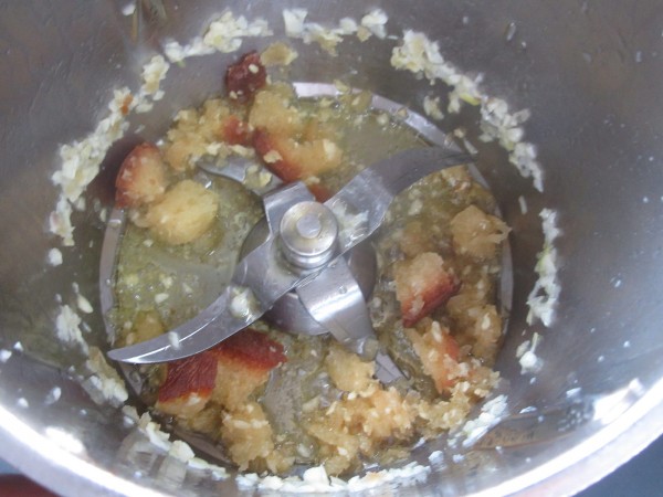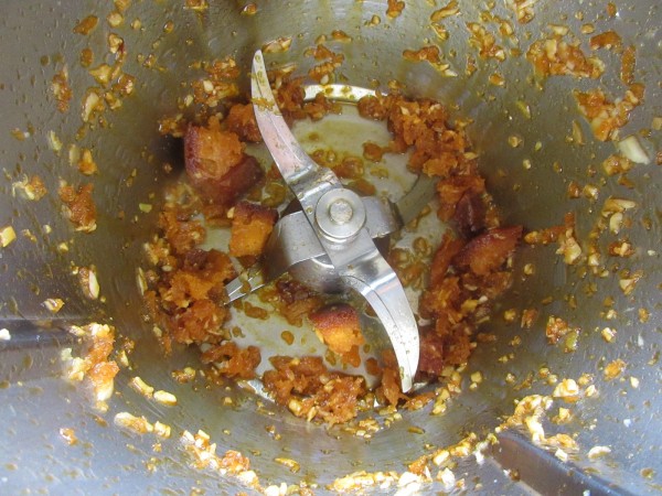 1- Picar los ajos, 4 seg. vel.5. Bajar restos hacia las cuchillas, añadir el pan en trocitos y el aceite, 6 min., Varoma, vel. cuchara.
