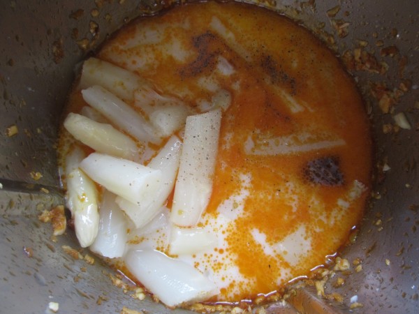 3- A continuación los espárragos en trozos (400 gr.), el jugo de los tarros o latas (250 gr.), leche ideal, sal, pimienta y nuez moscada, Triturar 30 seg. vel.10.
