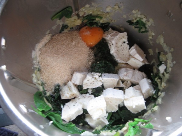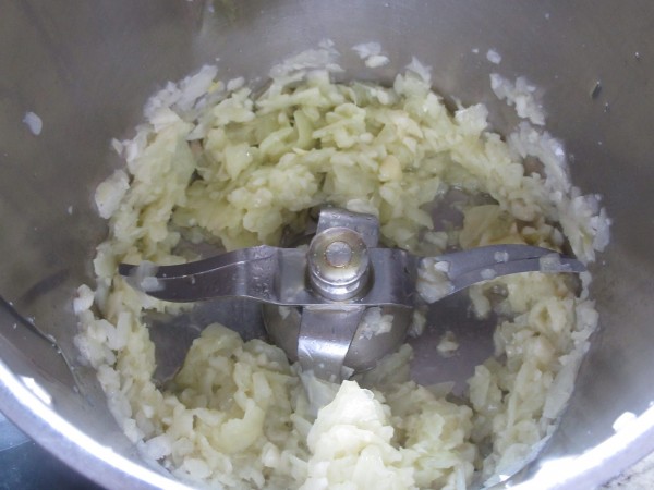3- Queso en trozos, pan rallado, huevo, sal y pimienta, 10 seg., giro izda., vel. 3. Llevar a un bol y dejar enfriar.