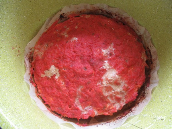 3- Forrar una cubeta con papel o silpat, extender la carne picada, cubrir con una capita de tomate. Yo pongo tomate casero, porque no nos gusta el ketchup, pero podéis poner el que os guste.