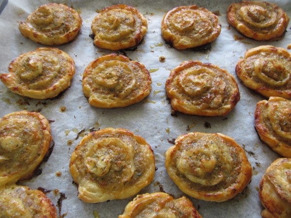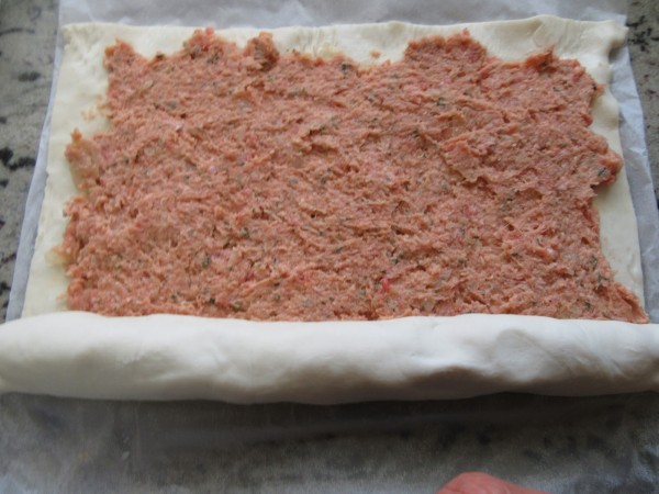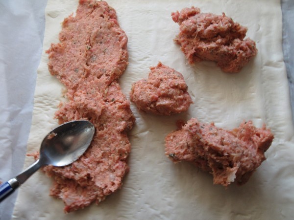 4- Estirar las láminas de hojaldre, extender la mitad de la carne en cada una. Enrollar y llevar el rollo a la nevera, envuelto en el mismo papel de hornear, como 20 minutos. Así lo cortaréis mejor al endurecer el hojaldre. Cortar en discos y aplastar un poco.