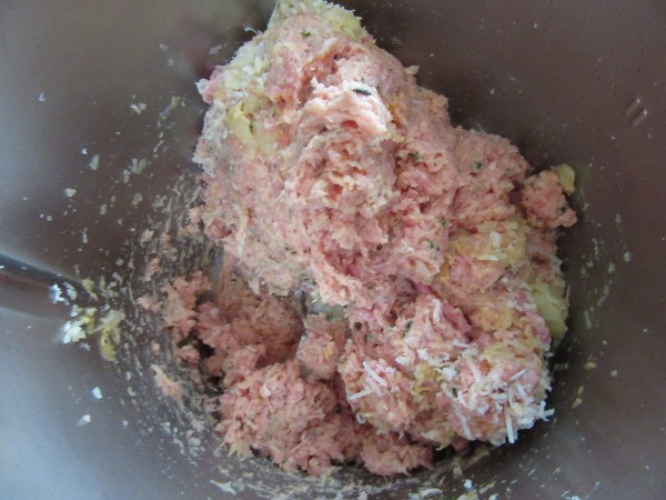 3- Añadir al vaso el ajo en polvo, orégano, perejil, carne picada, sal, tomate frito y queso rallado, 15 seg., giro izda, vel. 4.