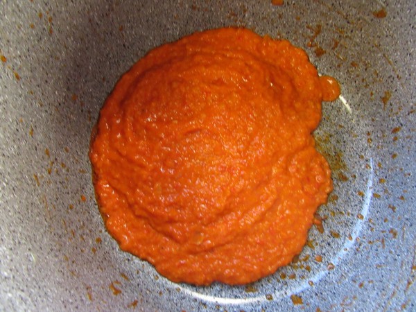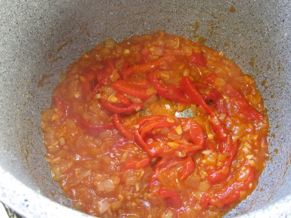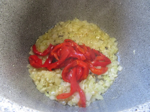 Preparación:1- Picar la cebolla y ajos menudos y pochar en menú sofreír. Añadir los pimientos asados en tiras, pochar 2 minutos, y el tomate frito. Después triturar el sofrito.