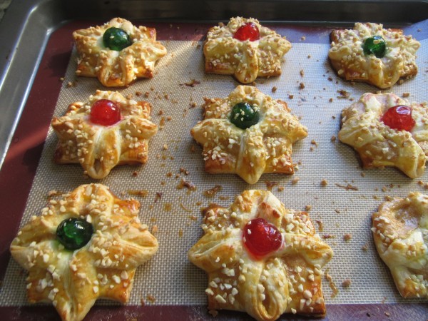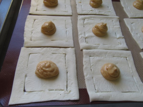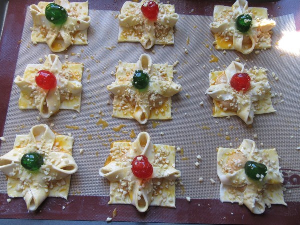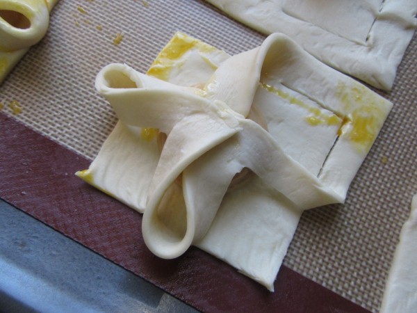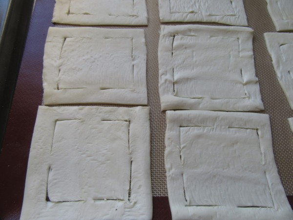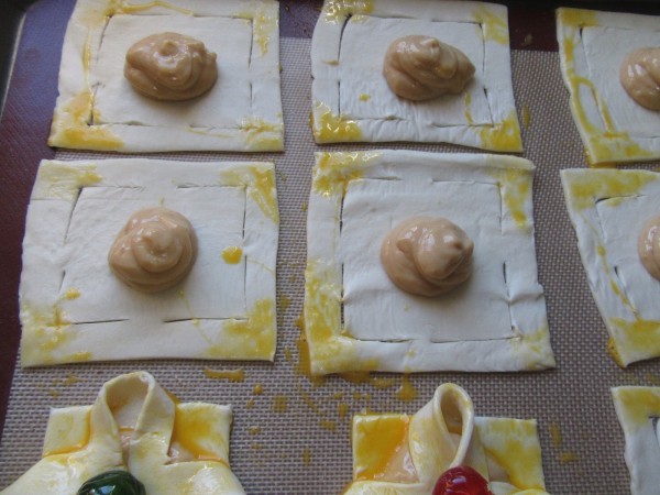 3- Estirar el hojaldre, cortar cada lámina en 9 cuadrados y hacer 4 cortes en las esquinas, como muestran las fotos, sin llegar al final. Pincelar de huevo las esquinitas, poner una cda. de crema en el centro, unir las esquinas cortadas hacia el centro, pincelar la superficie con más huevo, colocar una guinda y espolvorear granillo de almendra.