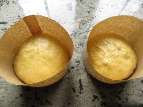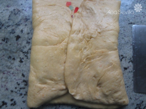 1- Añadir la levadura (15 gr.), azúcar, huevos, aroma, aceite oliva, harina y sal, 4 min., Espiga. Dejar levar en un lugar cálido tapado, hasta que doble volumen. Pasar a la meseta engrasada con aceite, estirar la masa, repartir el relleno y doblar formando una bola (O dos si hacéis dos piezas). Volcar en el molde de 900 gr. -1.000 gr., o 2 moldes de 500 gr. Tapar y dejar levar unas horas. Podéis dejarlo toda la noche tapado en la nevera hasta que triplique y llegue al borde del molde/s.. Hacer unos cortes en cruz con un cuchillo afilado o una tijera. (Opcional)