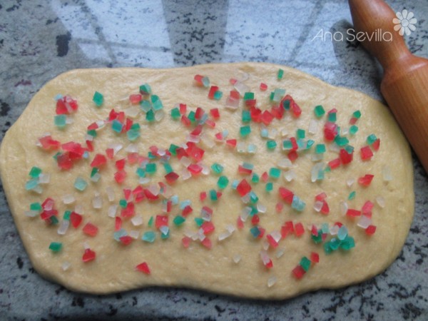 -Relleno a gustos: 150 gr. fruta escarchada ó pasas y frutos secos ó naranja confitada, chocolate....