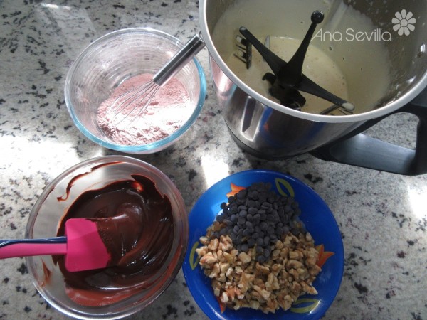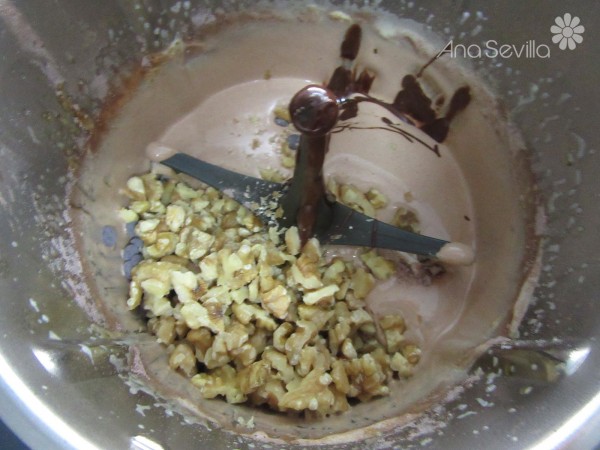3- Añadir la mezcla de harina, 10 seg. vel.2. El chocolate fundido, nueces y gotas de chocolate, 10 seg. vel.2. Quitar la mariposa y terminar de envolver. Llevar a un bol al congelador 30 minutos.