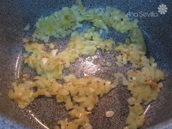 2- Picar muy menuda la cebolla y ajos y sofreír con aceite 8-10 minutos.