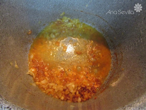 2- Picar muy menuda la cebolla y ajos y sofreír con aceite 8-10 minutos.