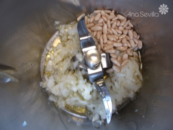 1- Picar cebolla y ajos, 2 seg. vel.5. Bajar restos hacia las cuchillas, añadir el aceite y piñones, 8 min., Varoma, vel. cuchara.