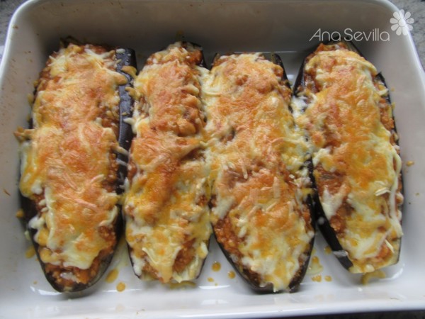 5- Rellenar las berenjenas, cubrir con queso rallado y gratinar unos 10 minutos hasta que tomen color.