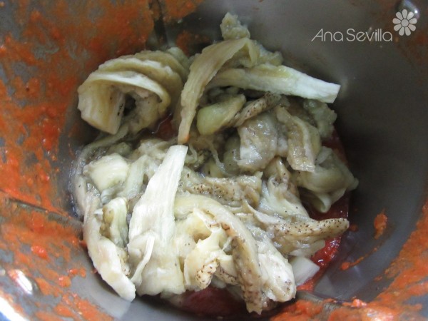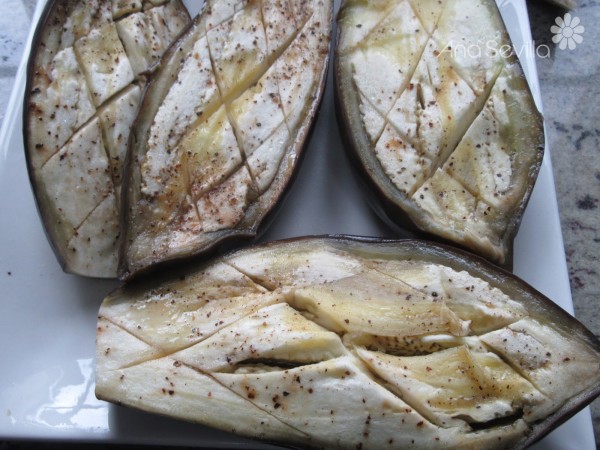 1- Cortar las berenjenas transversalmente, hacer unos cortes en cruz, salpimentar, tapar con film y llevar al microondas unos 12 minutos. Dejar enfriar y sacar la pulpa, reservar las pieles.