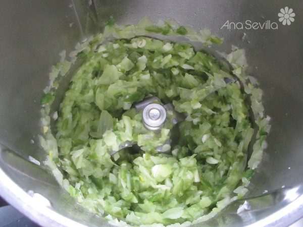 3- Cebolla, ajos y pimiento, 3 seg. vel.5. Bajar restos hacia las cuchillas, añadir 25 gr. de aceite y pochar, 10 min., Varoma, vel. cuchara.