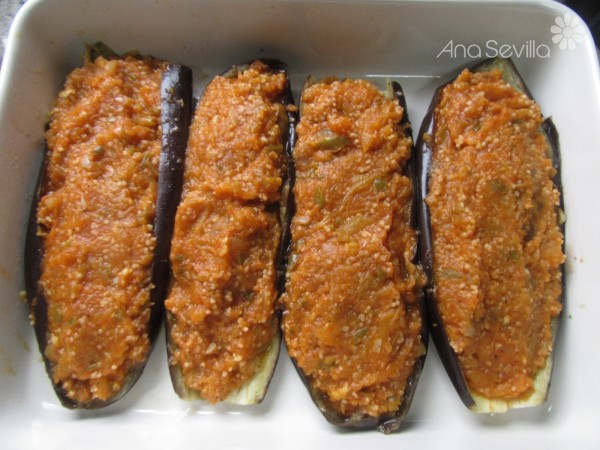 5- Rellenar las berenjenas, cubrir con queso rallado y gratinar unos 10 minutos hasta que tomen color.