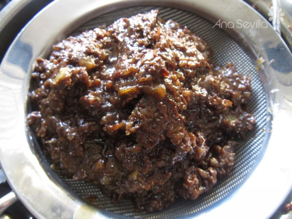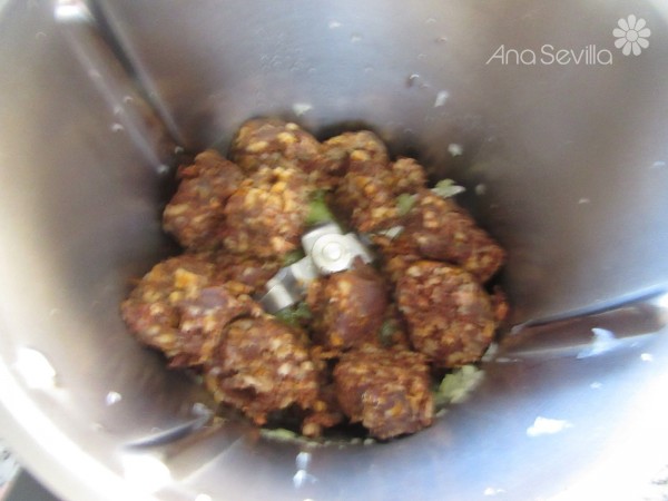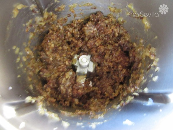 3- Quitar la tripa a la morcilla y echarla al vaso en trozos, 5 seg., vel.2. Después sofreír 10 min., 100º, vel. cuchara. Escurrir con un colador la grasa y dejar enfriar.