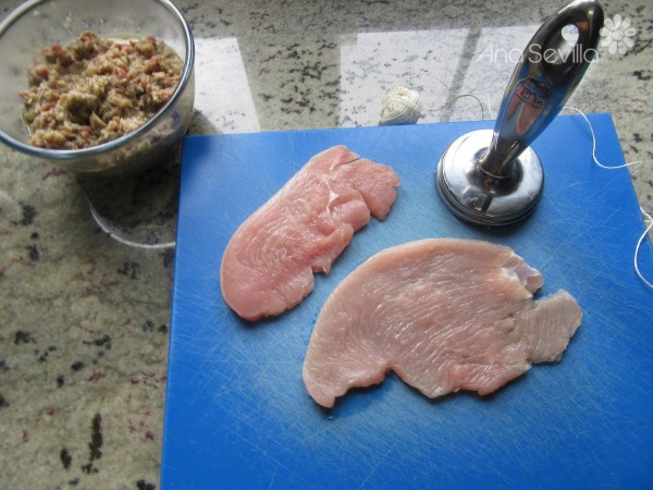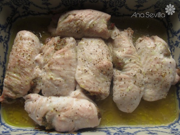 3- Espalmar los filetes de pavo un poco, para aplanarlos y salpimentar. En un extremo, poner una cucharada del relleno, hacer rollitos, e ir disponiéndolos en una fuente de horno engrasada. Rociar con un poco de aceite de oliva.
