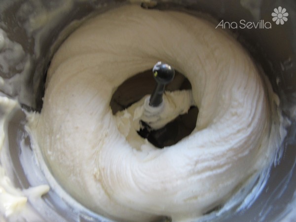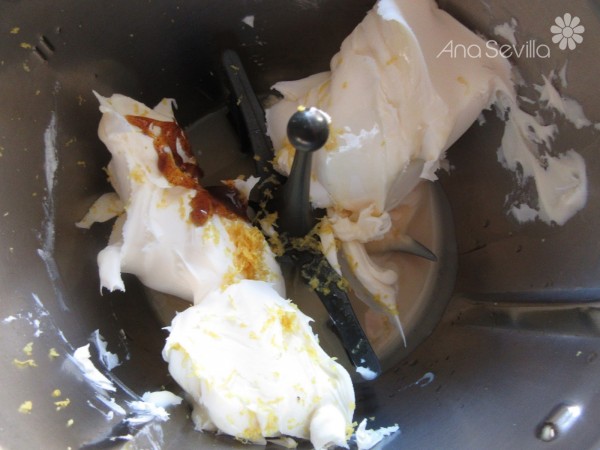 1- Colocar la mariposa, queso, leche condensada, ralladura, zumo y 1 cta. vainilla, 10 seg. vel. 3 y 1/5. Quitar la mariposa y terminar de envolver con la espátula. Reservar en un bol.