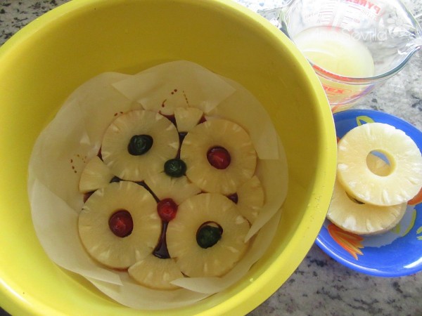 Preparación:1- Forrar la cubeta y caramelizar con unos hilos de caramelo el fondo y repartir 5 rodajas de piña y guindas. Reservar.