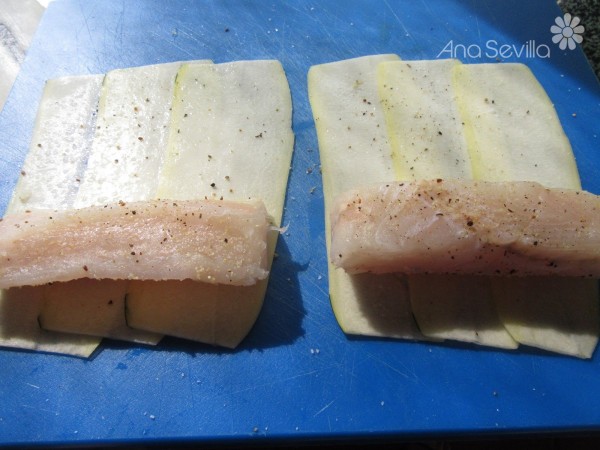 Enrollar la merluza en las láminas de calabacín
