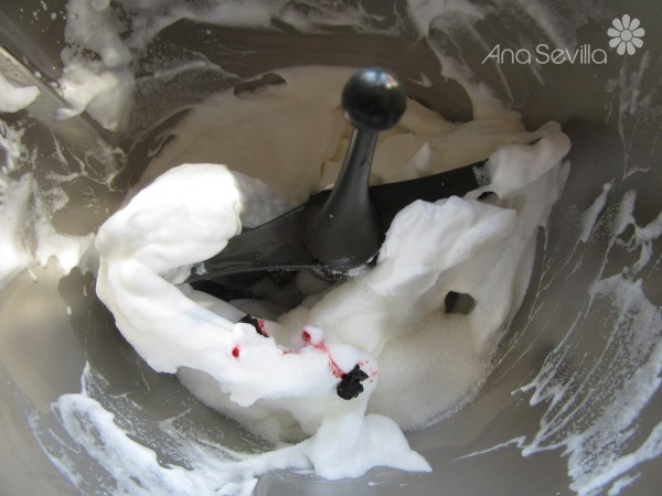 3- Pasar la rodaja de limón por el vaso, cuchillas y mariposa. Echar las claras al vaso con un pellizco de sal, 4 min., vel. 3 y 1/2. Añadir el azúcar normal y colorante si son de color y otros 2 min., vel. 3 y 1/2.