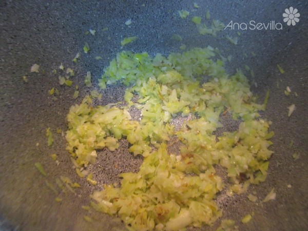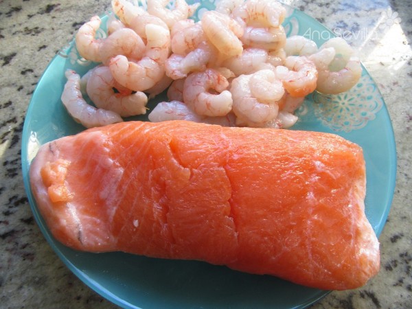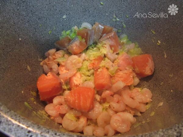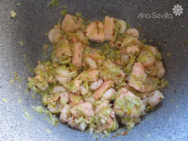 Preparación:1- Pochar el puerro, cebolla y ajos bien picaditos con un poco de aceite. Añadir el salmón en trozos y las gambas y sofreír 2-3 minutos sólo que cambie de color.