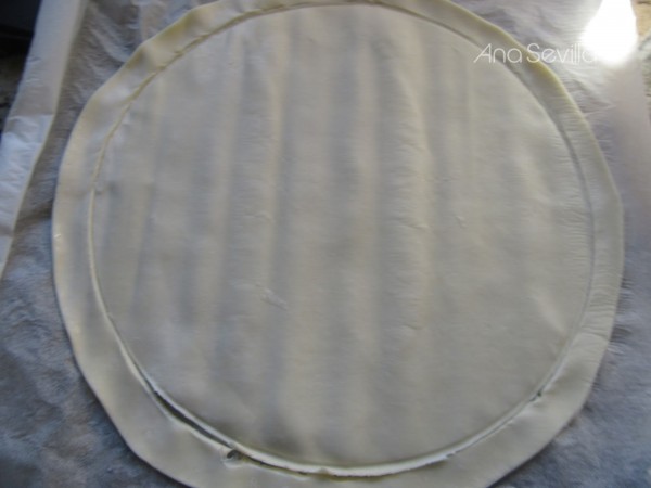 3- Cortar el hojaldre junto al papel de hornear con el que viene debajo, 3 ó 4 cm. , más grande que el diámetro de la cubeta, si tenéis el cabezal de hornear, justo el diámetro del adaptador plateado. Introducir dentro del fondo de la cubeta y aplastar un poco los bordes contra las paredes y pinchar bien con un tenedor. Volcar la preparación anterior.