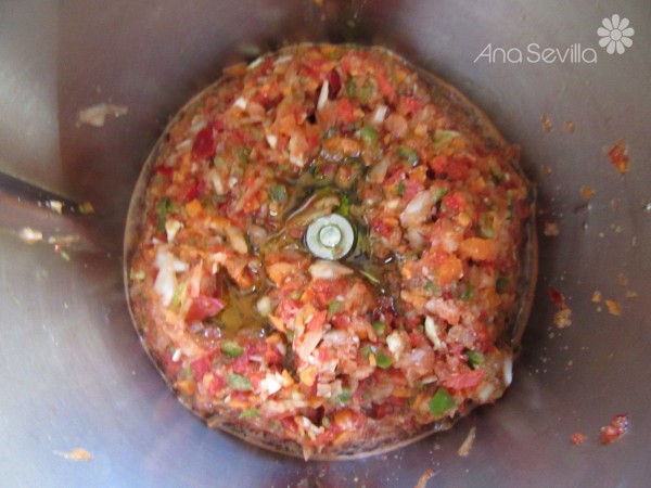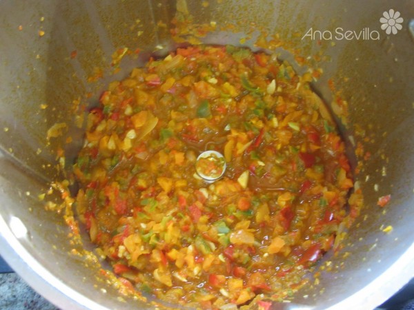 2- Picar la cebolla, ajos, pimiento verde y rojo y zanahoria, 5 seg. vel.5. Añadir el aceite y pellizco sal, sofreír 12 min. Varoma (120º), vel, 1. (En este paso podéis triturar un poco la verdura en vel.4, si os gusta que no se note).