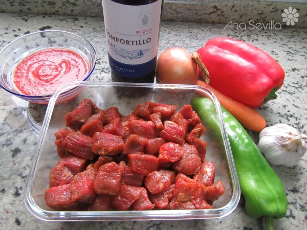 1- Adobar la carne en trozos pequeños con 1 cta. sal, las especias majadas y el pimentón. Reservar.