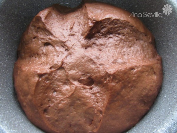 1- Echar al vaso todos los ingredientes por el orden que se indica IMPORTANTE: TODOS LOS INGREDIENTES A TEMP. AMBIENTE: Harina, cacao puro, bicarbonato, agua, leche, levadura (Deshacer un poco con los dedos), azúcar glas, sal, mantequilla, huevo y vainilla. Programar 10 seg. vel.4. y después 4 min. Espiga.