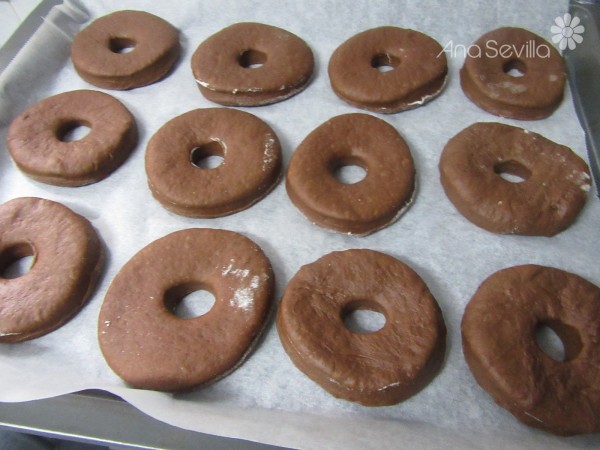 3- Estirar la masa, no debería necesitarse más harina, si véis que está muy pegajosa, poner un poco, pero sin pasarse o no quedarán esponjosos. Cortar con cortapastas, yo utilizo un aro de emplatar y una boquilla ancha, me gusta más que el cortador de donuts.