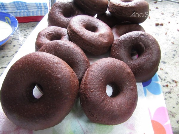 2- Añadir el chocolate,30 seg., vel. 2. Volcar rápidamente en un bol, sumergir la superficie de los donuts y espolvorear adornitos. Hacerlo rápido, que si no, se cristaliza. Dejar unos minutos endurecer.